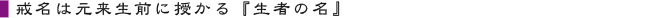 『寿戒』とは生前に戒名(法名)を授かることをいいます。戒名といえば死後に僧侶から授かる名前と思われがちですが、元来戒名は生前に授かるものです。戒を授かりこれを自誓したときいただく名前が戒名です。『寿戒』することにより自分自身はもとより世の中の真理が見え、新しい充実した人生が始まります。まさに『寿陵』と同じく「長寿」、「子孫繁栄」につながっていきます。